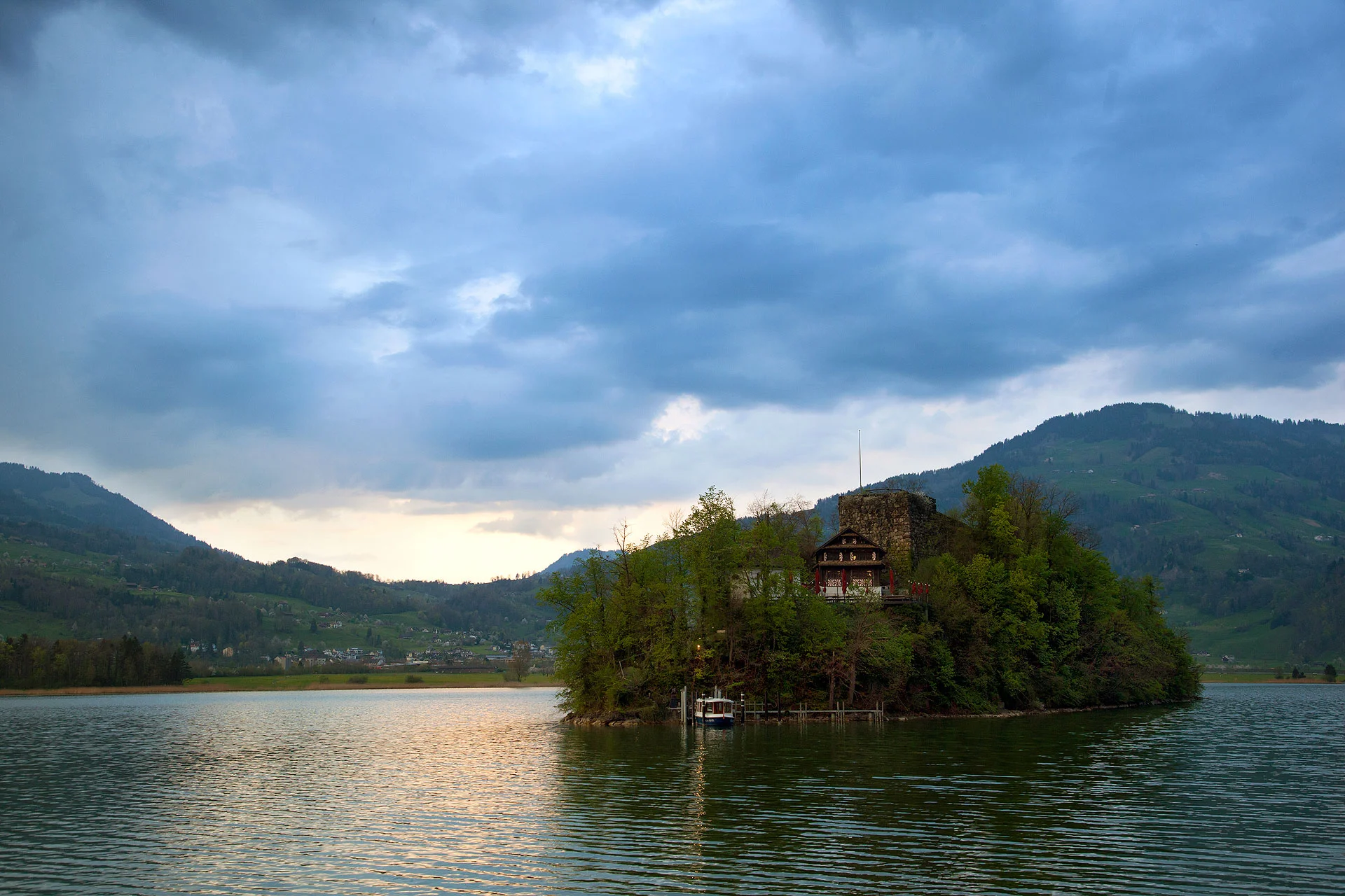 After the break, we headed back on the road towards the Alps - but it had already started to turn dark, so we didn't get much pictures . On the way back, we went through a few towns in Germany and a brief stop in some castles, but the majority of the drive was in Switzerland. We passed through a few towns near the alps and stopped to admire the majestic view of the mountains. We stopped near a town called Laurez, and got some pictures of Island of Schwanau, situated on Lake Lauerz.